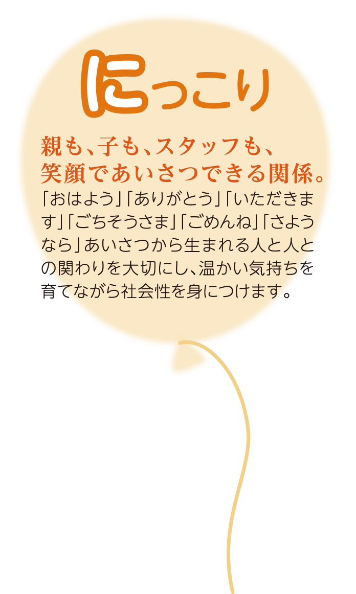 〇「おはよう」「ありがとう」「いただきます」「ごちそうさま」「ごめんね」「さようなら」など挨拶から生まれる人と人との関わりを大切にし、温かい気持ちを育て、社会性を身につけていきます