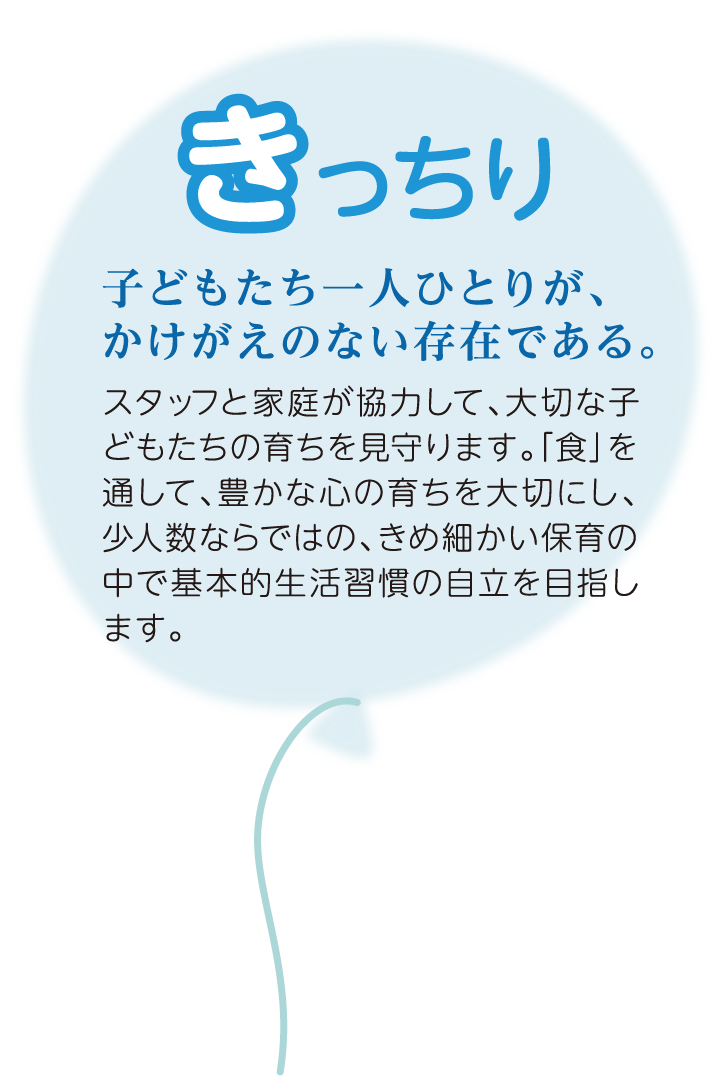 私たちは子どもたちの気持ちを尊重し、子どもたちを信じてゆっくり待ちます。 子どもたちの「してほしい」、「聞いてほしい」に応え、「その子らしさ」を大切にします。